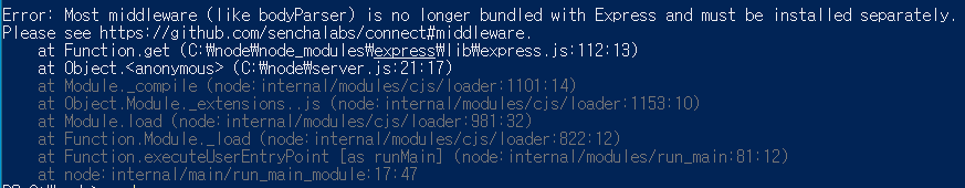 node.js 서버를 구동시킨 cmd상에 위와같은 오류가 발생한다.