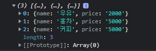 배열에서 추출하기 전까지 배열 내에 담겨있는 객체 형태는 { 0: {name: '우유', price: '2000'} }와 같이 object로 묶여있는것이다.