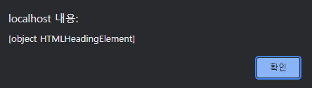 코드를 실행하고 Click 문자열 텍스트노드가 연결된 h1노드를 클릭하면 경고창에 [object HTMLHeadingElement] 문구가 출력된다.