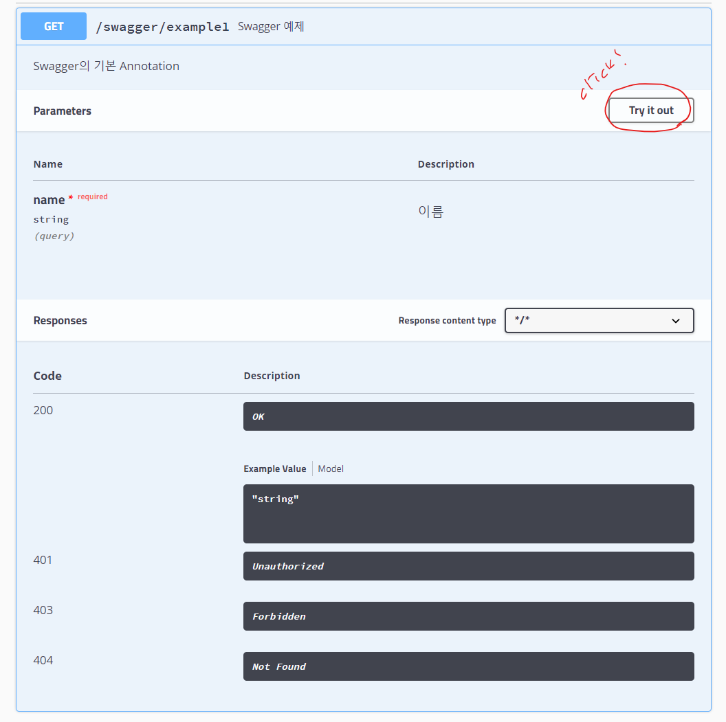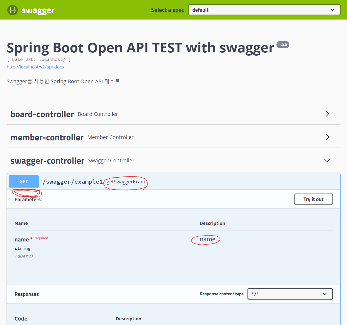 둘의 차이점은 @ApiOperation 와 @ApiParam Annotation을 적용하지 않은 화면에서는 매핑주소 우측에 기본적으로 메소드명이 자리하고, Description의 파라미터명이 변수명 자체로 표현됩니다.
