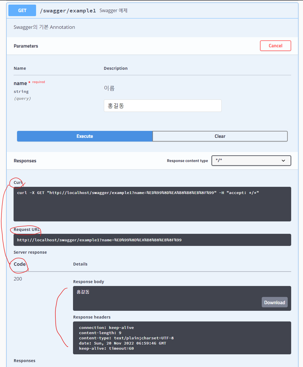 위 화면에서 Try it out 버튼을 클릭하면 각 파라미터별 값을 입력할 수 있는 폼 화면이 열리는데, 각 항목의 값을 기입하고 Execute 버튼을 클릭하면 해당 URL로 Rest통신이 실행되어 요청URL과 그에대한 결과값 모두 확인할 수 있게 됩니다.