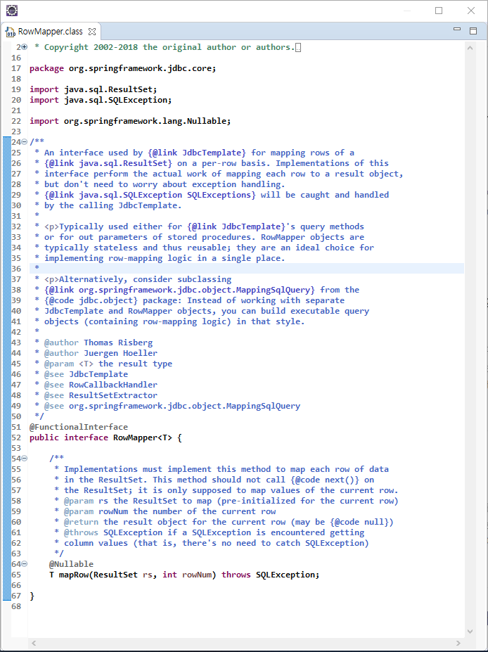 RowMapper에는 단1개의 추상메서드인 mapRow()메서드만 존재하므로 람다식까지 구현이 가능했던 것이죠.