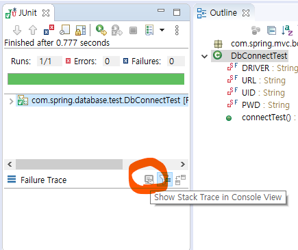 junit창 우측 바가 초록색이면 성공, 빨간색이면 실패 입니다.