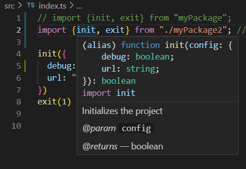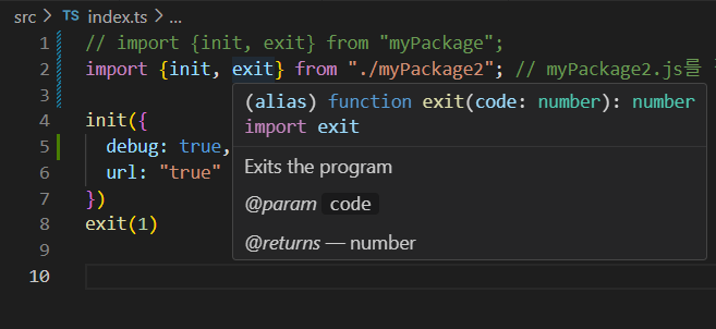 import {init, exit} from "./myPackage"; // myPackage.js를 직접 불러온다. (myPackage.d.ts가 없을경우 에러발생하지않음)
