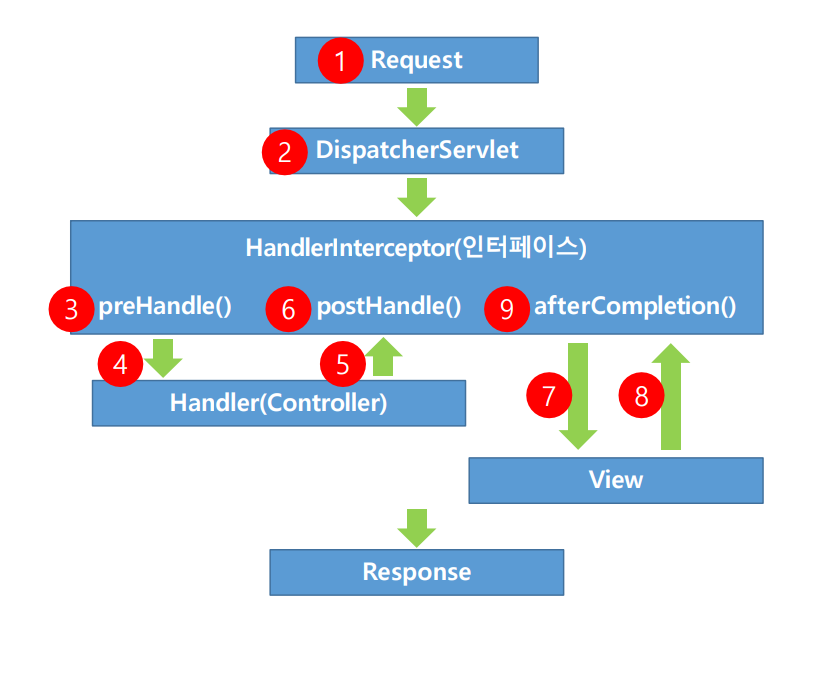 요청이 들어오면 제일먼저 공통적인 처리를 DispatcherServlet을 통해 거쳐가고 Controller로 진입하기 전 중간에 Interceptor를 두어 preHandle() , postHandle() , afterCompletion() 의 기능을 가지고 있습니다.